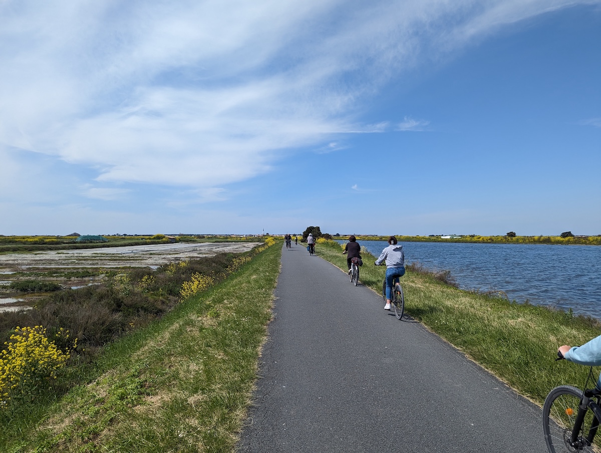 La première partie longe le littoral avec ses cabanes ostréicoles typiques – parfait pour une halte dégustation d’huîtres fraîches ! Puis la piste cyclable serpente entre les bassins peu profonds et les cabanes de sauniers. Le paysage change, l’architecture laisse place à de vastes horizons où seul le ciel occupe tout l’espace.