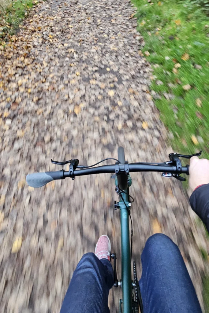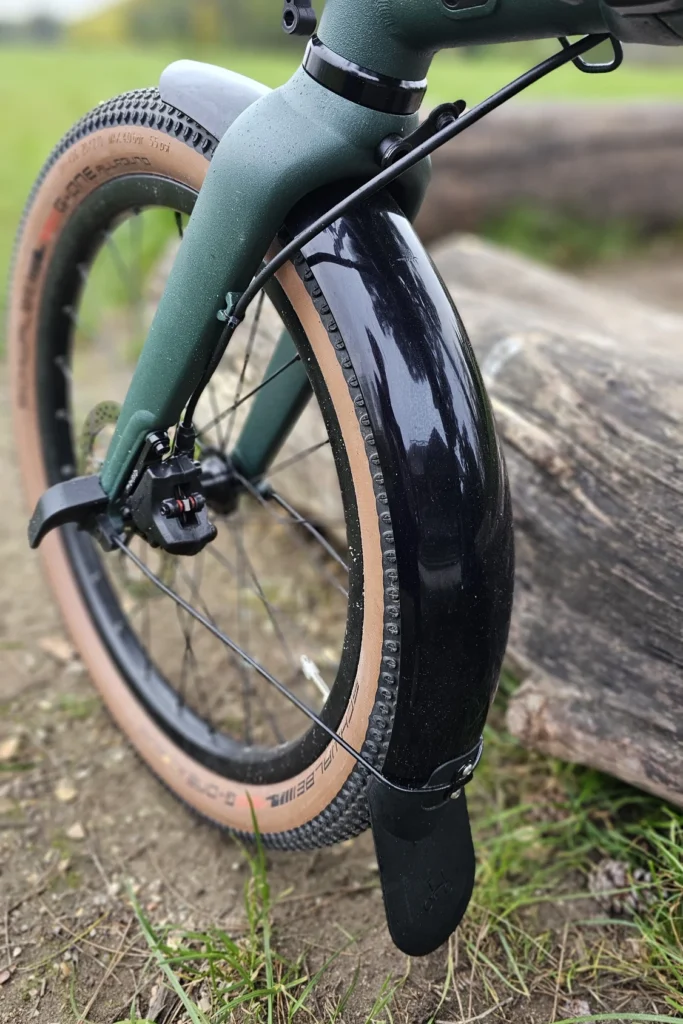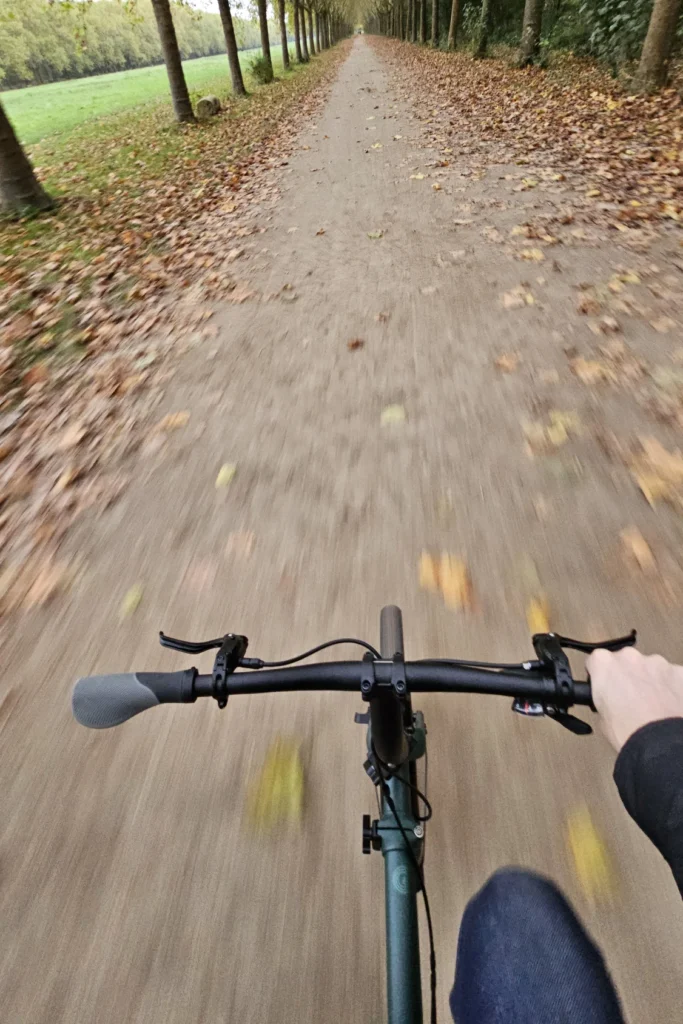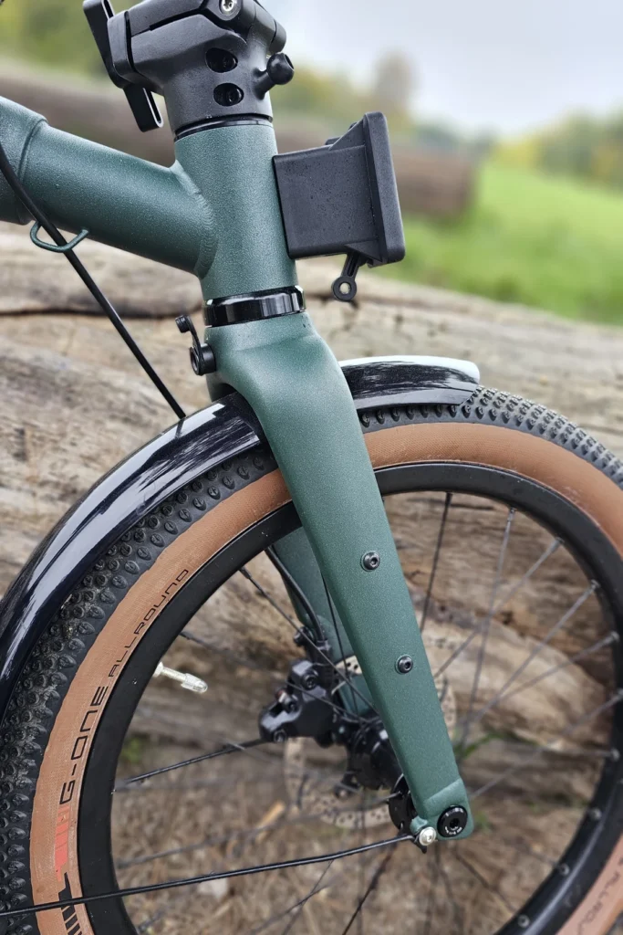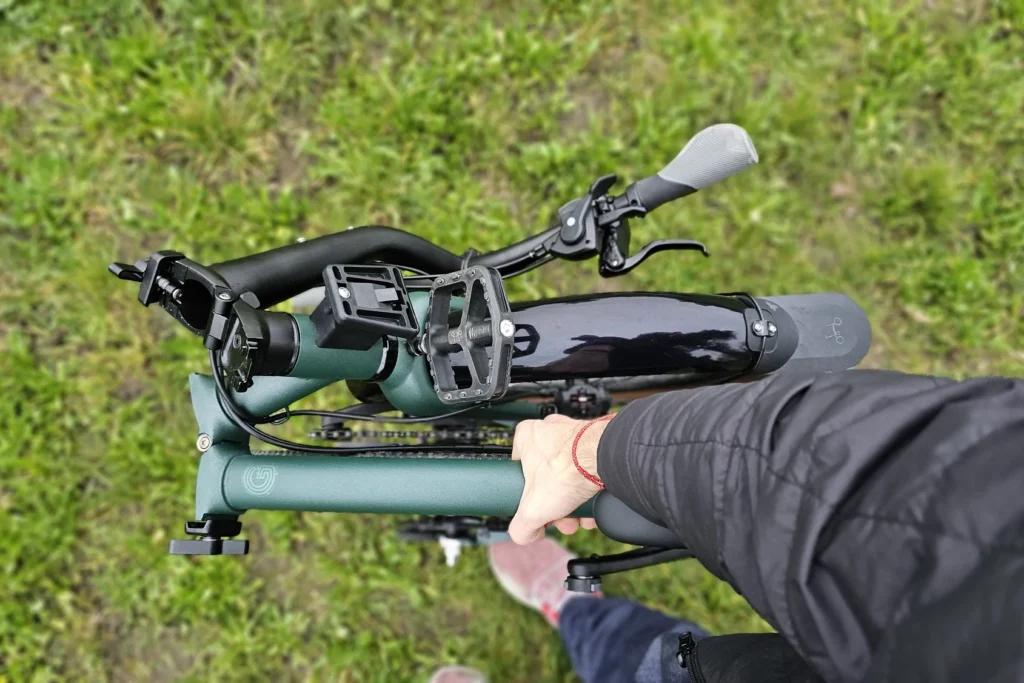 Les roues de 20 pouces font passer Brompton vers un comportement de vrai vélo, aidés par le profil “gravel” des pneus. Le G Line ajoute en plus un guidon droit très large, augmentant la stabilité de conduite avec le renfort des pédales VTT, surtout sur les sentiers. On peut ainsi autant fouler le gravier, la terre, la boue (pas trop quand même), les flaques d’eau en ville, le tout sans se faire peur.