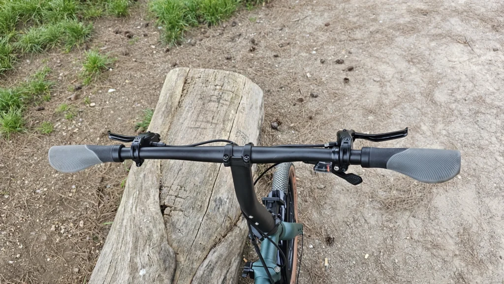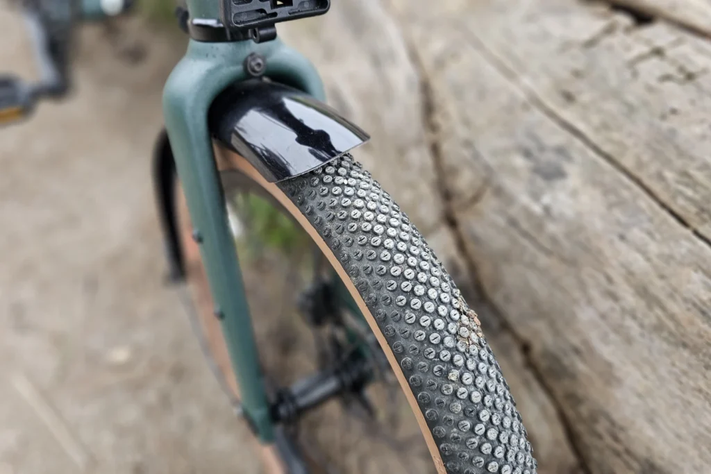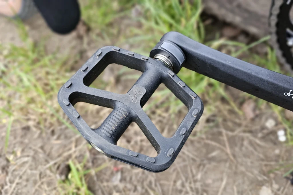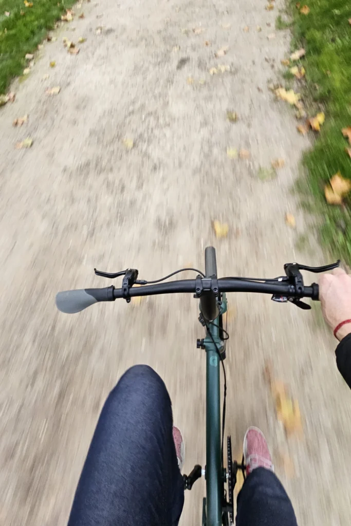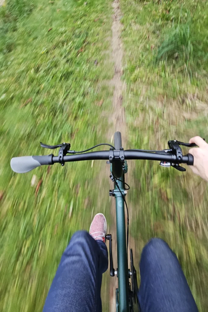 Les roues de 20 pouces font passer Brompton vers un comportement de vrai vélo, aidés par le profil “gravel” des pneus. Le G Line ajoute en plus un guidon droit très large, augmentant la stabilité de conduite avec le renfort des pédales VTT, surtout sur les sentiers. On peut ainsi autant fouler le gravier, la terre, la boue (pas trop quand même), les flaques d’eau en ville, le tout sans se faire peur.