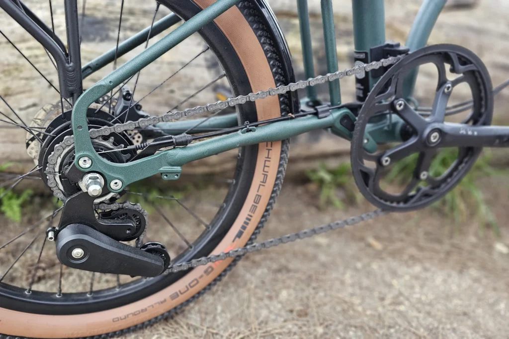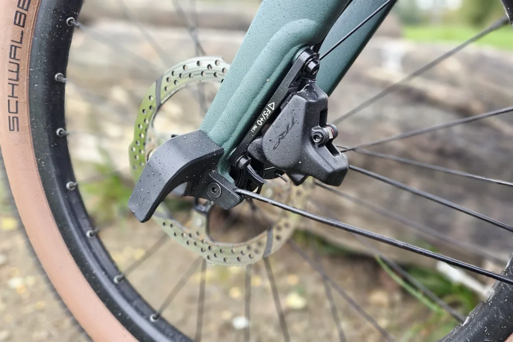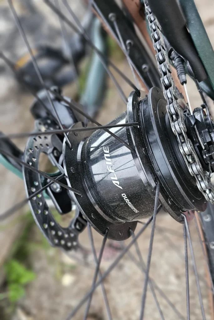Les freins hydrauliques à disque TRP – haut de gamme de Tektro – sont aussi très efficaces. L’utilisation mixte se traduit parfaitement par le choix de la transmission. Le moyeu à vitesses intégrées Shimano Alfine propose un développement de 8 vitesses, bien pour le tout-chemin et les dénivelés. Il permet aussi le passage des vitesses à l’arrêt, parfait en ville au feu rouge.