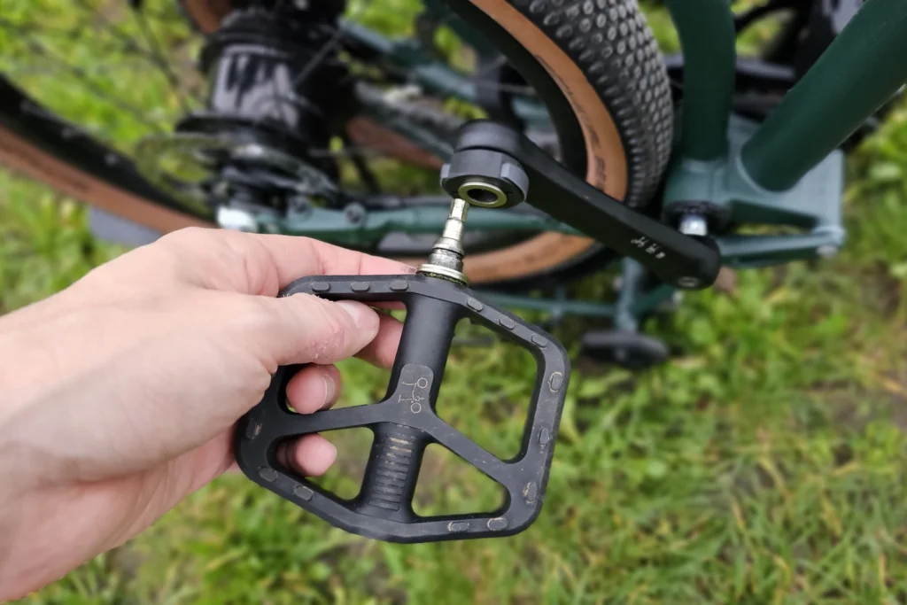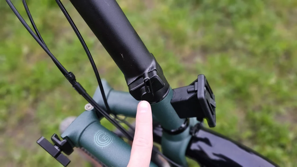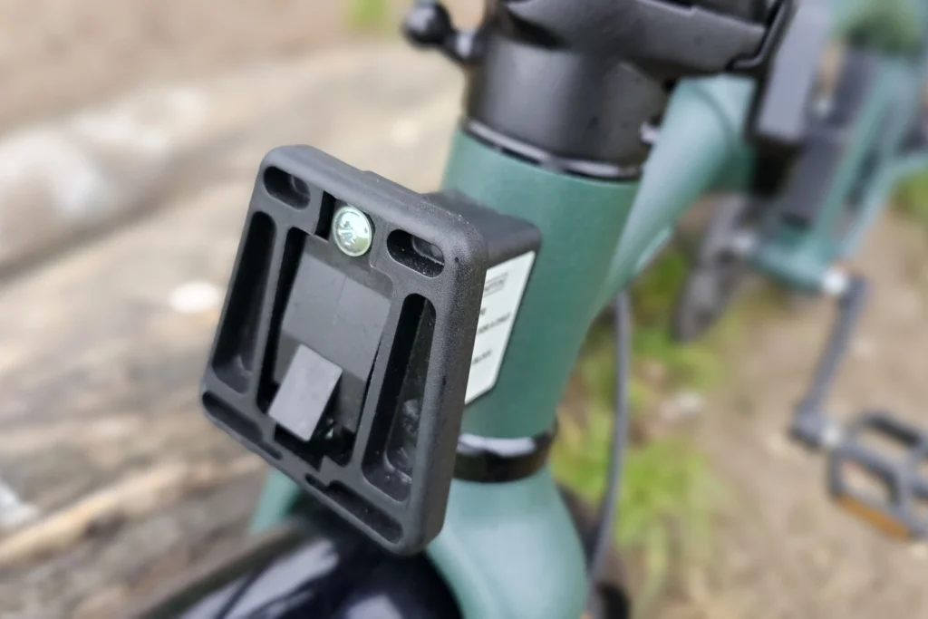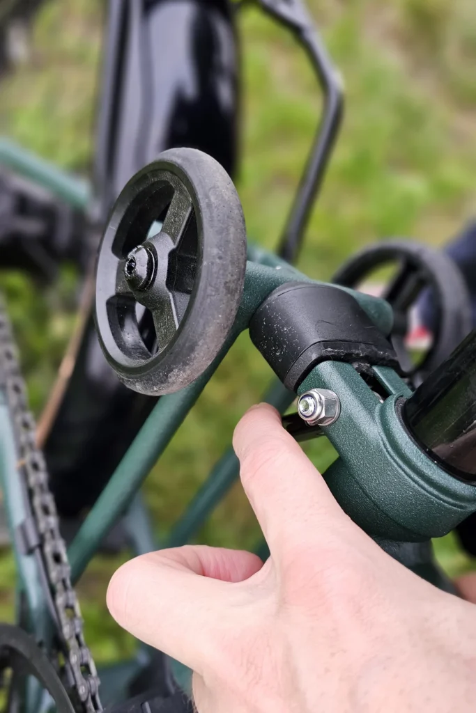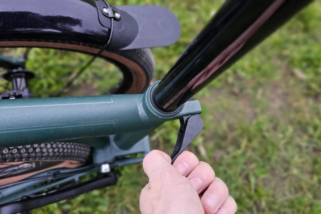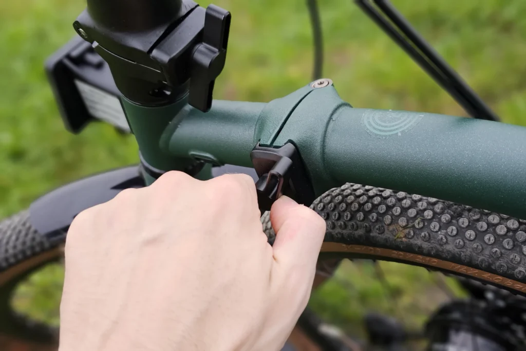 Chaque étape s’accompagne d’une protection pour bloquer les éléments : levier pour la roue arrière, aimant pour la roue avant et un embout se clipsant sur la potence. On peut également enlever la pédale gauche, logeable sur un trou magnétique sur le cadre. Le tout prend environ 15-20 secondes.