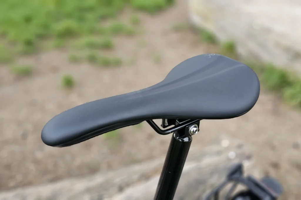 Ce vélo pliant ne possède pas de suspension, c’est un rigide classique. Néanmoins, son cadre acier est assez souple sur les gros chocs, mais ce sont les pneus qui font l’effort. Les Schwalbe G-One Allround sont à flancs hauts, permettant un amortissement agréable sur les chemins caillouteux ou les pavés. La selle est certes typée sport, or la position active – penchée vers l’avant – équilibre le corps, les mains épousant des poignées ergonomiques confortables sur longs trajets.