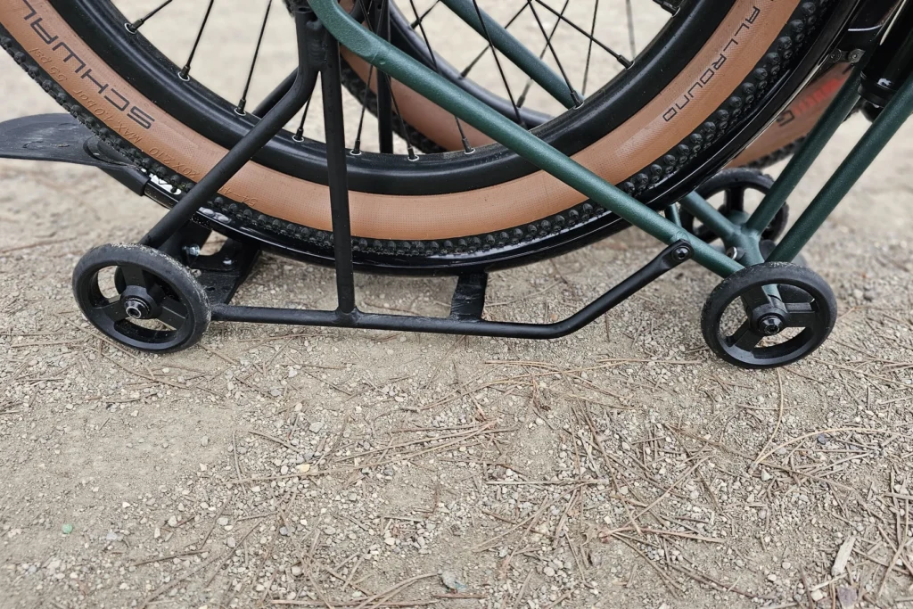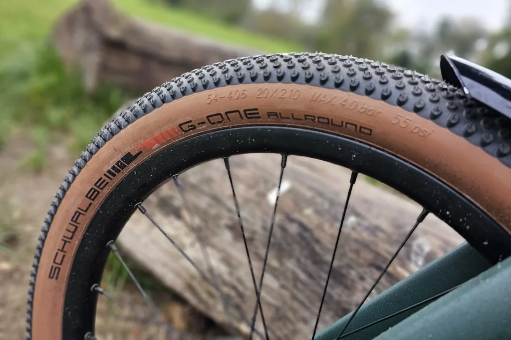 La grande différence entre le Brompton G Line et ses petits frères (A Line, C Line, etc), c’est la taille des roues. C’est le premier et seul vélo pliant 20 pouces du catalogue, après 5 décennies de 16 pouces ! La taille des roues augmente, ainsi que la largeur des roues. Les Schwalbe G-One Allround mesurent 2,1 pouces de large soit 53 mm.