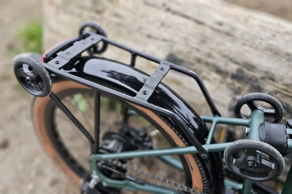 Le G Line pense à tout. Il inclut les garde-boues, longs pour éviter toute éclaboussure sur les pieds, et court à l’arrière pour ne pas frotter en mode plié. Pas de béquille, car le pliage de la roue arrière en quelques secondes joue déjà ce rôle selon Brompton. L’éclairage n’est pas inclus mais des réflecteurs sont bien intégrés, tout comme la sonnette (obligatoires).