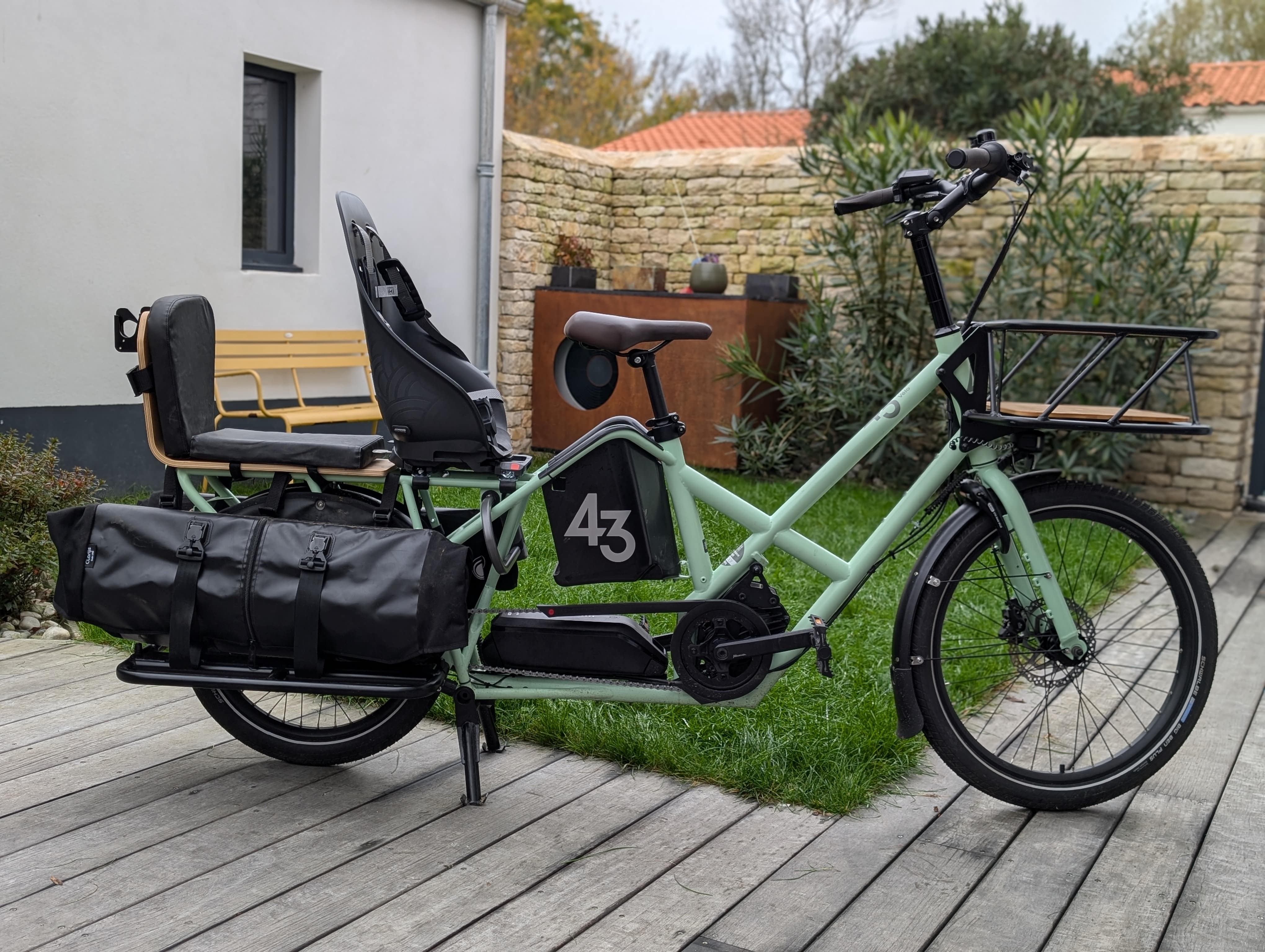 Le Bike 43 dispose dâune gamme dâaccessoires impressionnante. La marque a pensĂ© Ă tout : protection pluie, panier avant, sacs dĂ©diĂ©s, banquette « Roller Coaster » pour les enfants, diffĂ©rents repose-pieds, sacoches latĂ©rales, porte-bagages rallongĂ©s⊠De quoi adapter le vĂ©lo Ă tous les usages. Le revers de la mĂ©daille ? Les prix sont assez Ă©levĂ©s, il faut compter 360⏠pour la protection pluie ou 125⏠pour le panier avant, mĂȘme si ces deux derniers nous paraissent indispensables pour les raisons Ă©voquĂ©es. Par contre, les sacoches latĂ©rales nous ont déçus : peu pratiques Ă utiliser avec les enfants installĂ©s, leur prix Ă©levĂ© nâarrange rien.