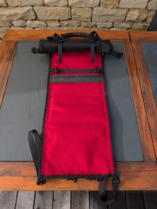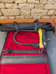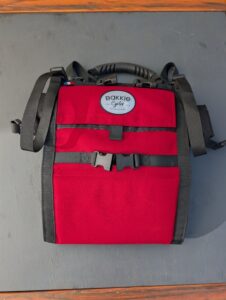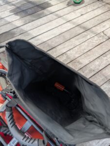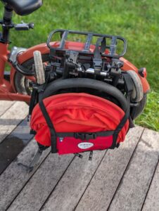J’ai la Bakkie Evo, celle avec la poche imperméable. Premier constat : elle gêne un tout petit peu quand on veut utiliser le support pour transporter de grandes choses. On peut la rouler pour libérer l’espace, mais elle reste présente.
